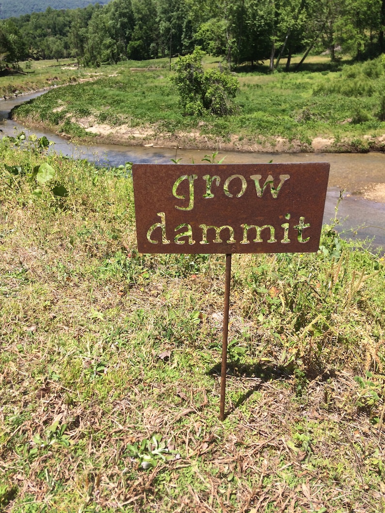 Tell your plants who's boss! This "grow dammit" metal garden sign is about 4 inches by 8.5 inches on a 12 inch stake. These are made of mild steel then left outside to rust.