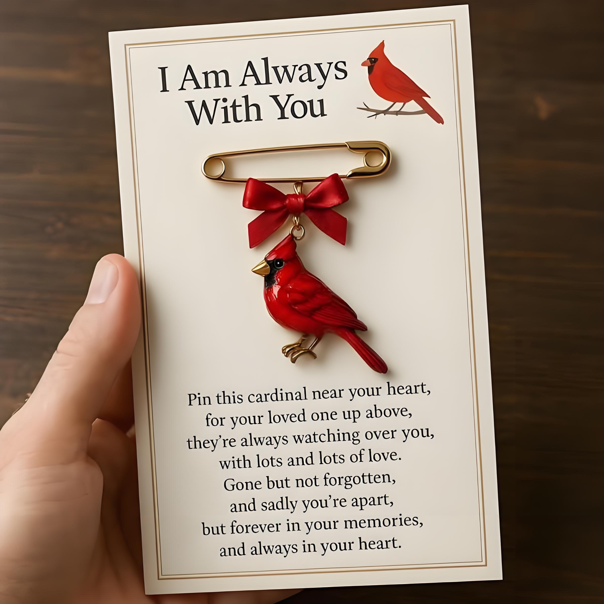 The accompanying cream-colored card carries a poetic message of love and remembrance: “Pin this cardinal near your heart, for your loved one up above, they’re always watching over you, with lots and lots of love...”The tender verse continues, offering solace and the promise of eternal memory. A small printed cardinal illustration accompanies the text, reinforcing the theme of hope and spiritual companionship.